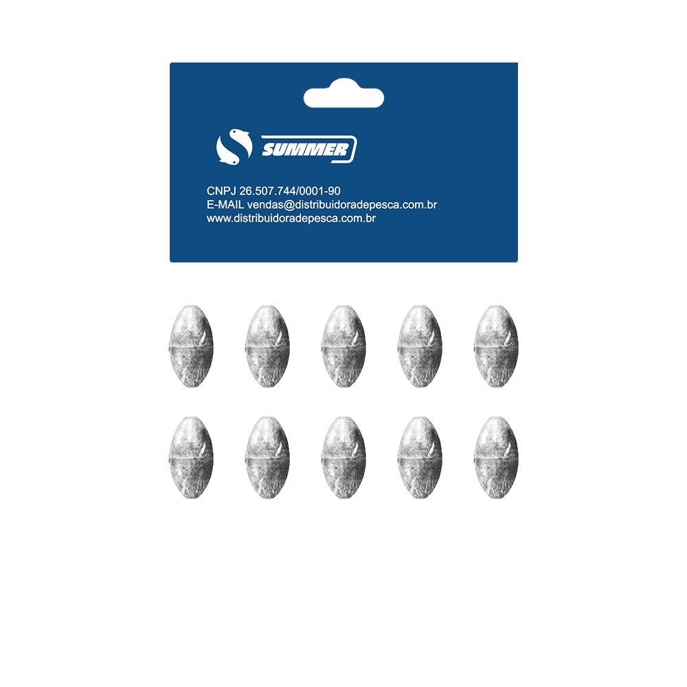 Chumbada Oliva Cartela 10pçs Summer, ideal para uso em: Rio, Lagos, Represas, Pesqueiros, Mar, Costões e outros. Auxilia no arremesso e também controla a fixação do anzol no fundo da água.