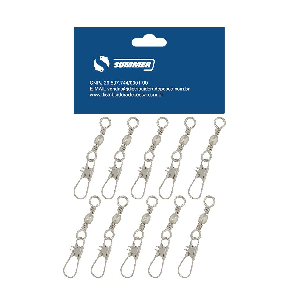 Girador Com Snap BSS Nickel N° 3 Cartela 10pçs Summer, ideal para evitar a torção da linha e o snap facilita a troca da isca artificial ou anzol. Pode ser usado tanto com linha Fluorocarbon Leader, Monofilamento ou Multifilamento. Não oxida facilmente.