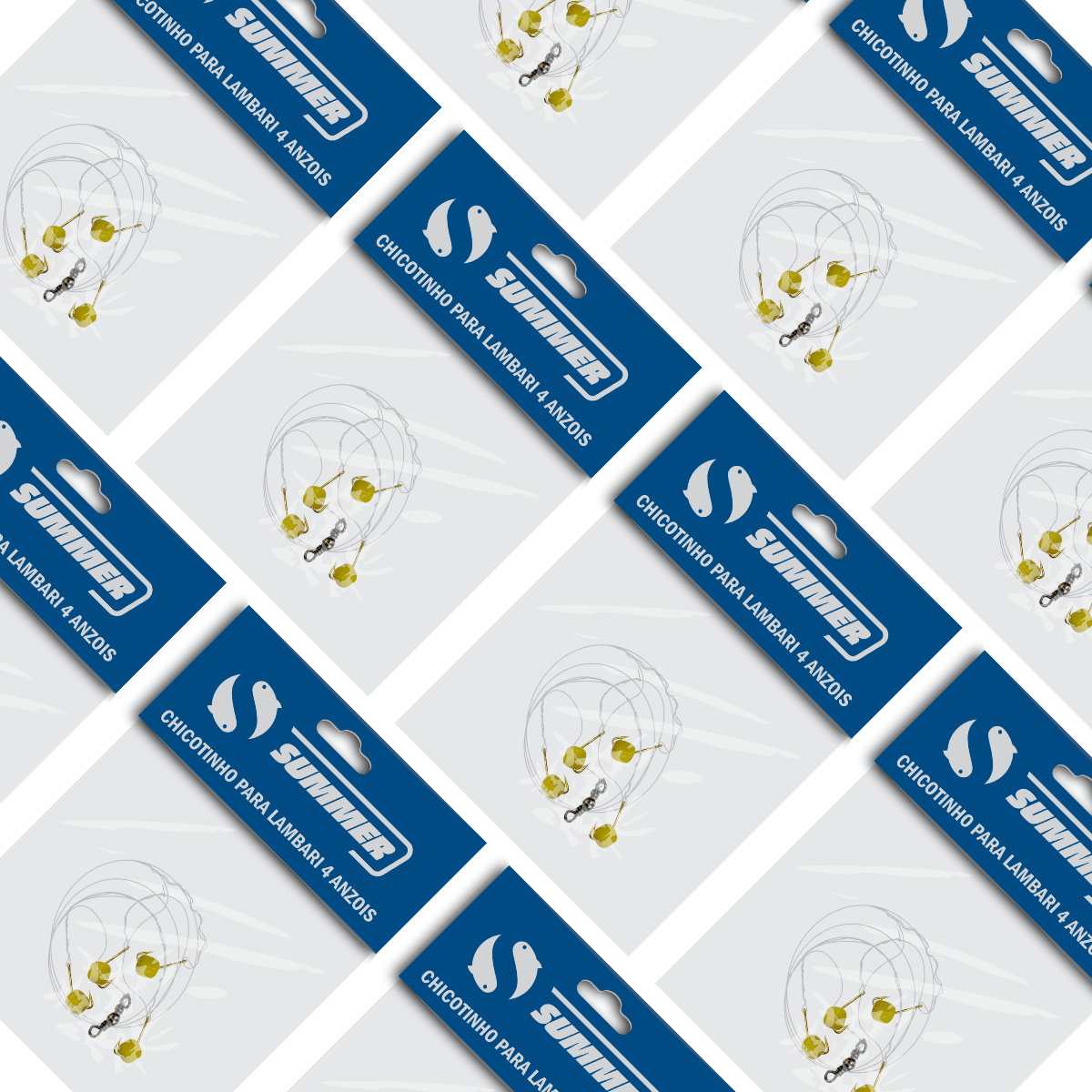 Kit com 10 chicotinhos prontos para pesca de lambari da marca Summer. Cada um vem montado com 4 anzóis Crystal Gold nº14 e miçangas atrativas, feitos para facilitar a pescaria sem precisar de isca natural ou ração.