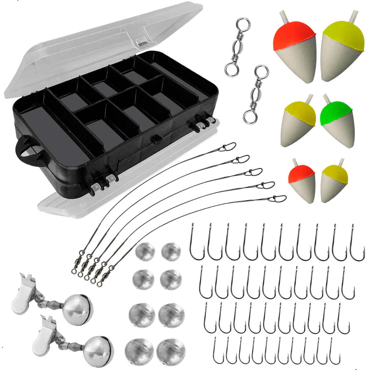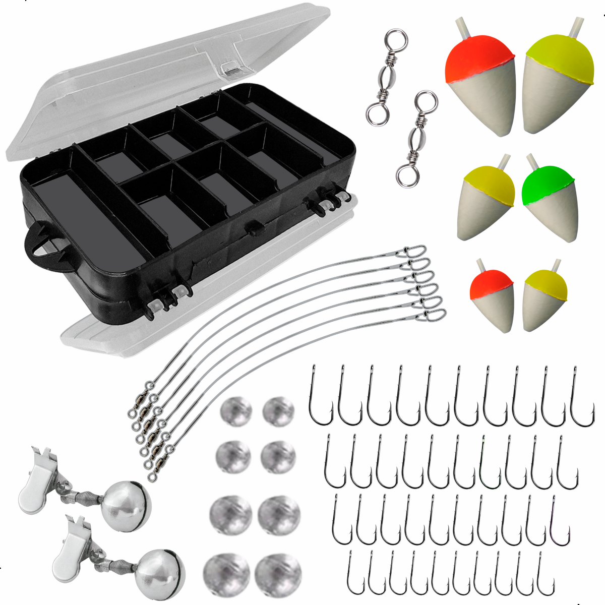 Kit de acessórios de pesca completo para deixar sua tralha mais prática, organizada e produtiva. Conta com anzóis Marine Sports 4330 Strong Nickel resistentes e afiados que garantem fisgadas firmes, giradores que evitam torções na linha e dão mais naturalidade às iscas, bóias coloridas que facilitam a visualização até dos menores toques do peixe, empates encastoados em cabo de aço com snap e girador que protegem contra peixes de dentes afiados e permitem troca rápida de iscas, além do estojo organizador duplo Arqplast 8002, resistente e compacto para manter todos os acessórios bem guardados e à vista. Um conjunto versátil e eficiente para pescarias em água doce ou salgada.