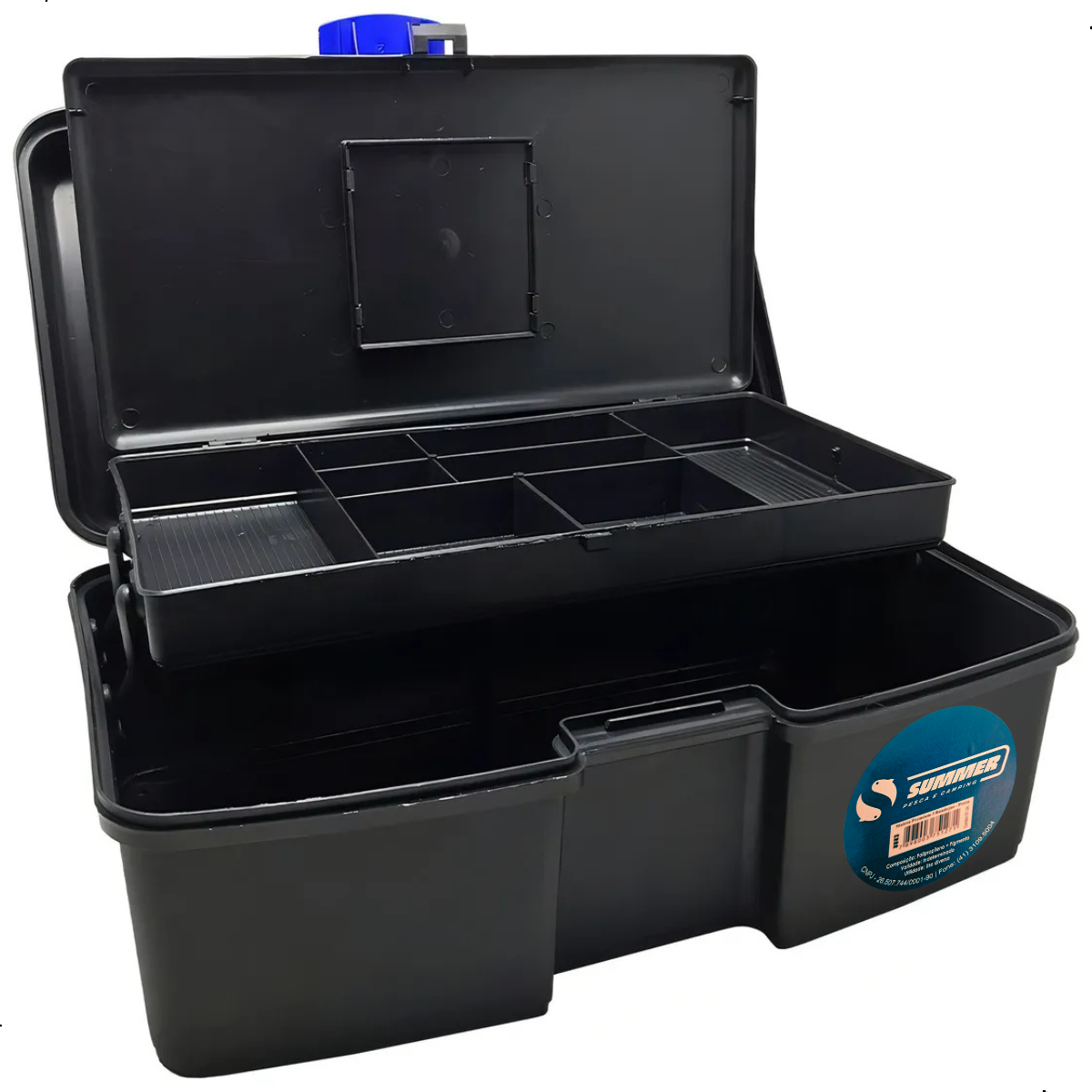 Maleta de pesca 1 bandeja articulada Summer, ideal para organizar e guardar alicate, tesoura, canivete, iscas artificiais, anzóis, chumbadas e entre outros. Fabricada em polipropileno de alta resistência, possui uma bandeja articulável.