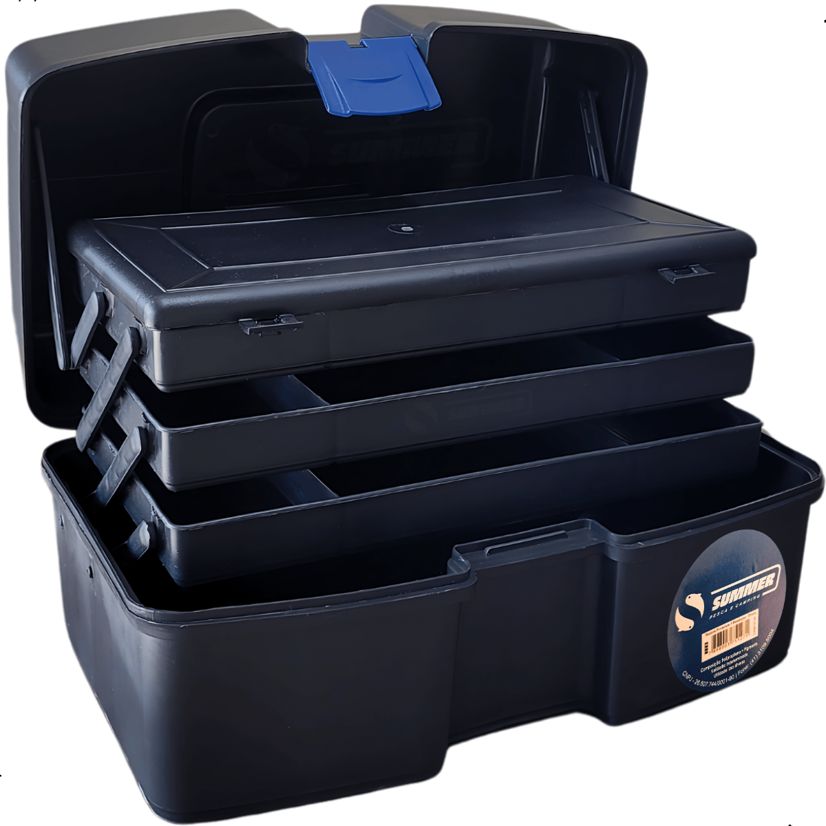 Maleta de pesca com 3 bandejas articuladas Summer, desenvolvida para oferecer praticidade, organização e segurança no transporte de acessórios de pesca. É ideal para armazenar e separar itens como alicate, tesoura, canivete, iscas artificiais, anzóis, chumbadas, giradores e outros pequenos acessórios, mantendo tudo sempre visível e de fácil acesso durante a pescaria. Seu sistema interno com bandejas articuláveis permite melhor aproveitamento do espaço, facilitando a visualização e a organização dos equipamentos.