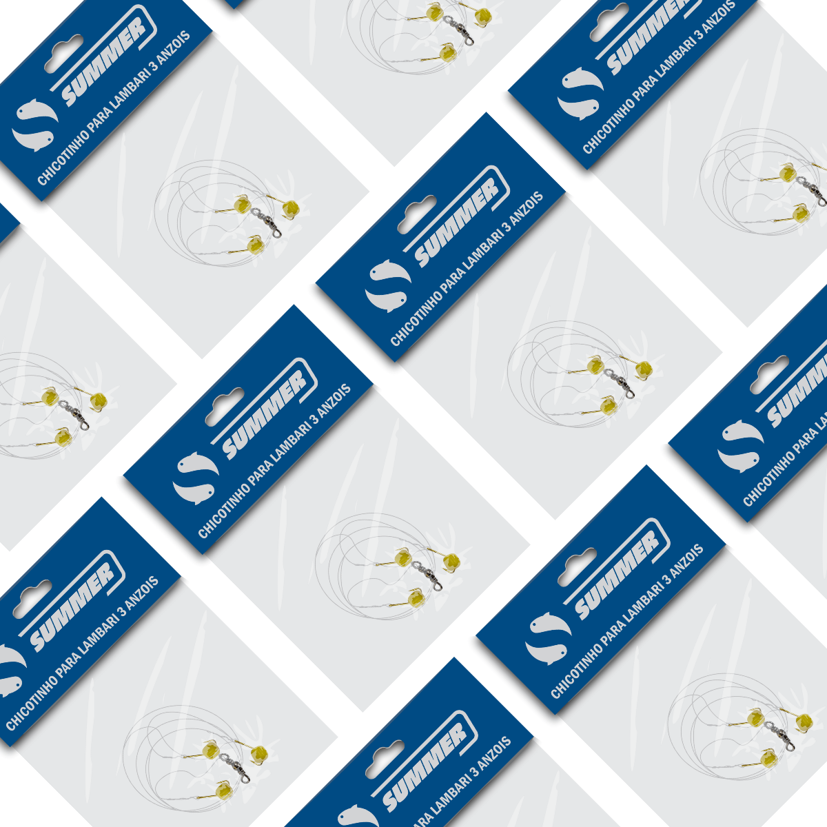 Kit com 10 chicotinhos prontos para pesca de lambari da marca Summer. Cada um vem montado com 3 anzóis Crystal Gold nº14 e miçangas atrativas, feitos para facilitar a pescaria sem precisar de isca natural ou ração.
