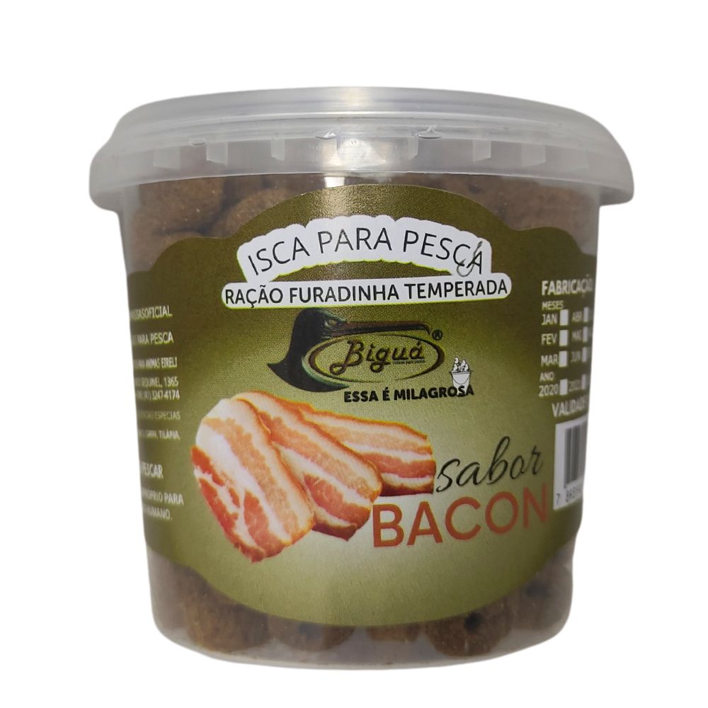 Ração de Pesca Furadinha Bacon 90g Biguá, essa é milagrosa, com essência especial o que atrai muito aos peixes de diversas espécies. Pronta para o uso, já vem furada o que facilita colocar no anzol.